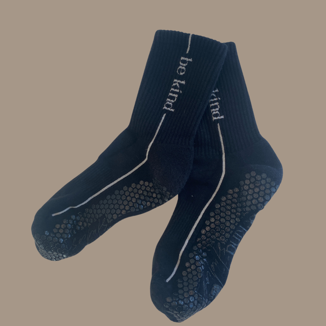 Unleash your inner badass with our "be kind" pilates grip socks! These one-size socks feature black details and grips at the bottom with be kind studios logo, perfect for studio and at home use. Let your feet do the talking (and gripping) as you get into your pilates flow.